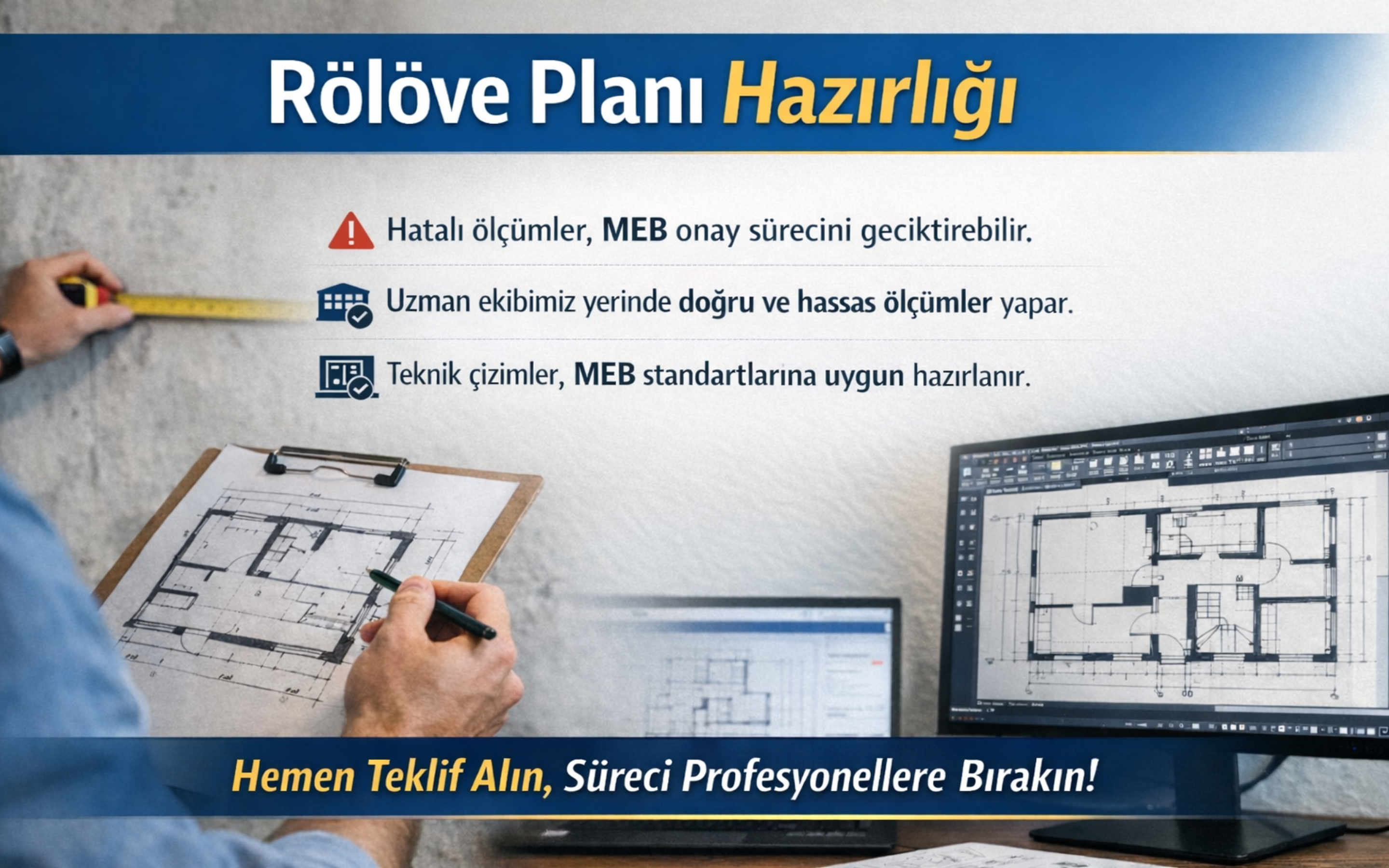 2026 yılı itibarıyla sıkılaşan MEB denetimleri ve teknik belge kontrolleri nedeniyle rölöve planının uzman mimarlar tarafından, yönetmeliklere uygun şekilde hazırlanması büyük önem taşımaktadır. Doğru hazırlanan bir rölöve planı, ruhsat ve onay sürecinin hızlı ve sorunsuz ilerlemesini sağlar.